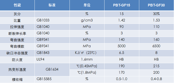 牌號(hào):PBT-GF15、PBT-GF30
